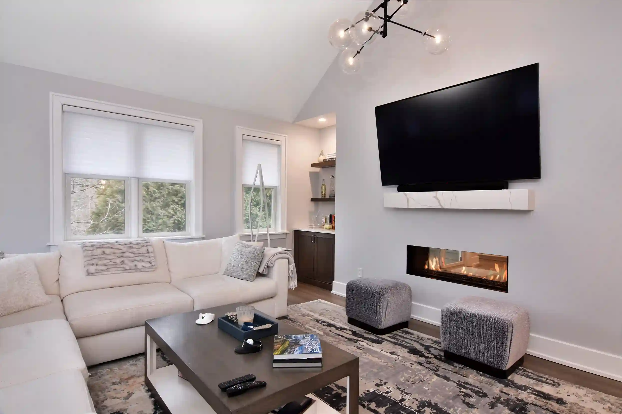 We isolate work zones when possible, protect floors and paths of travel, and manage staging so the home stays organized during construction.